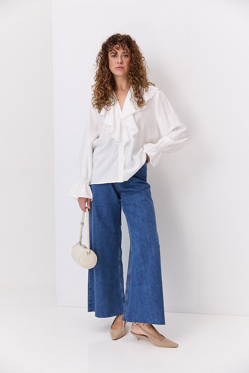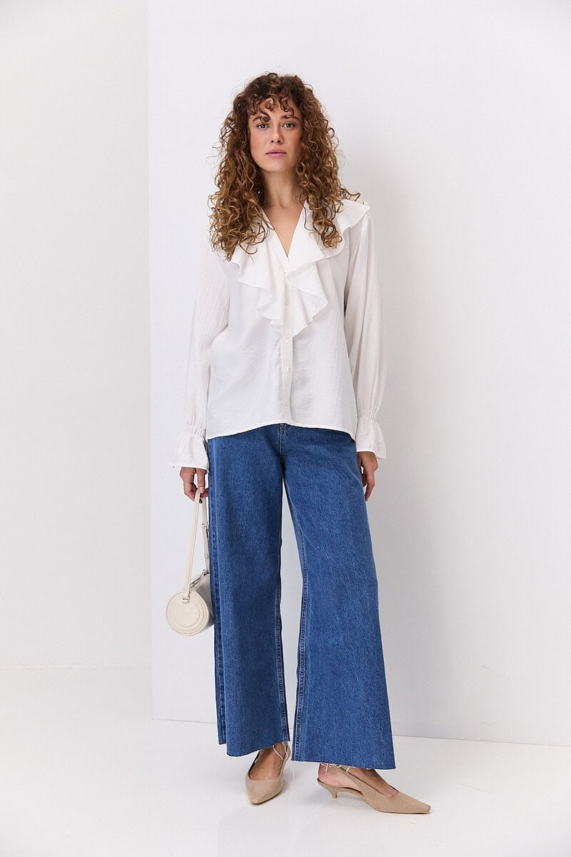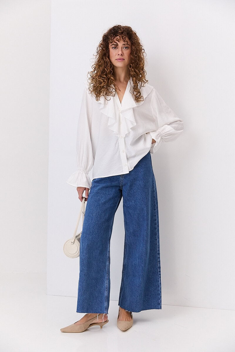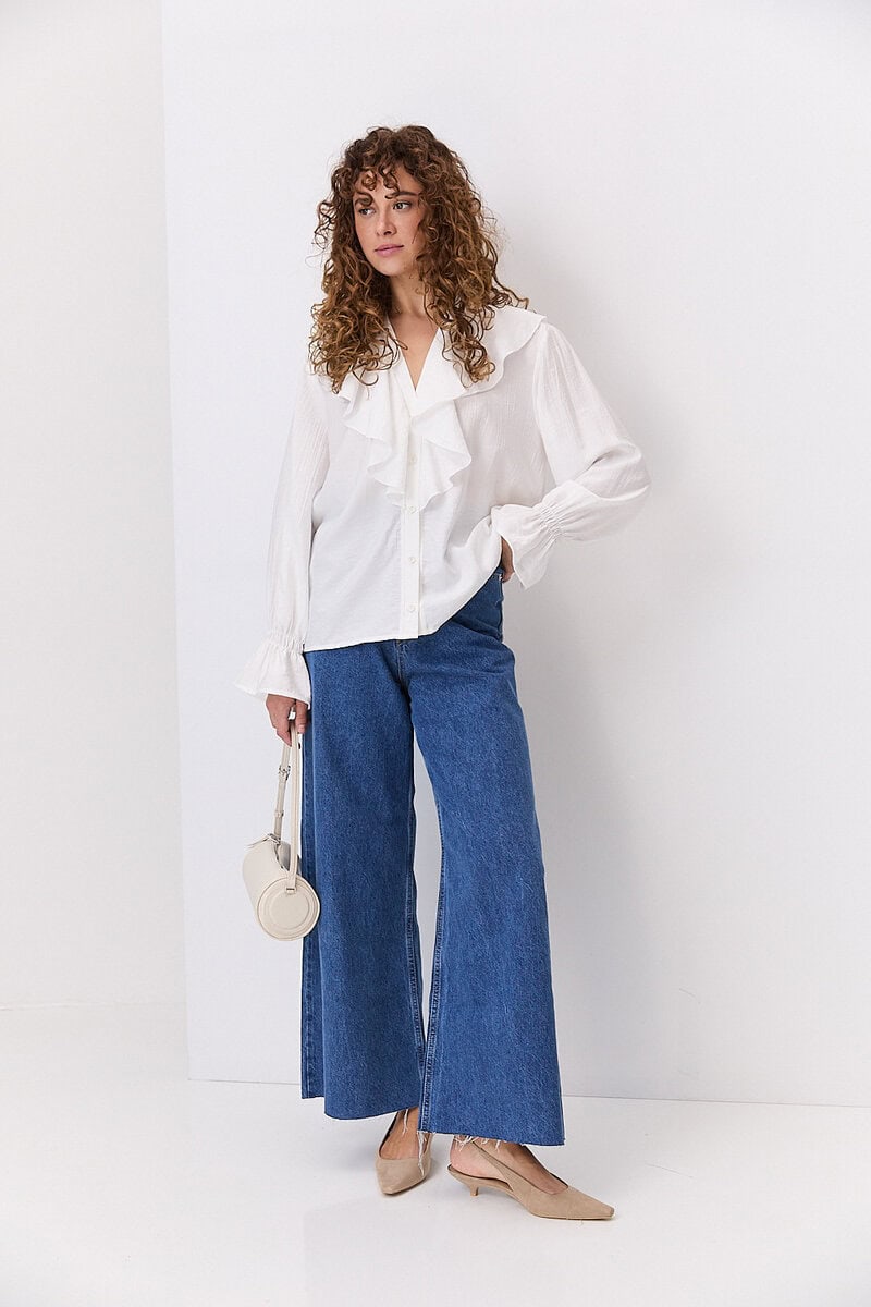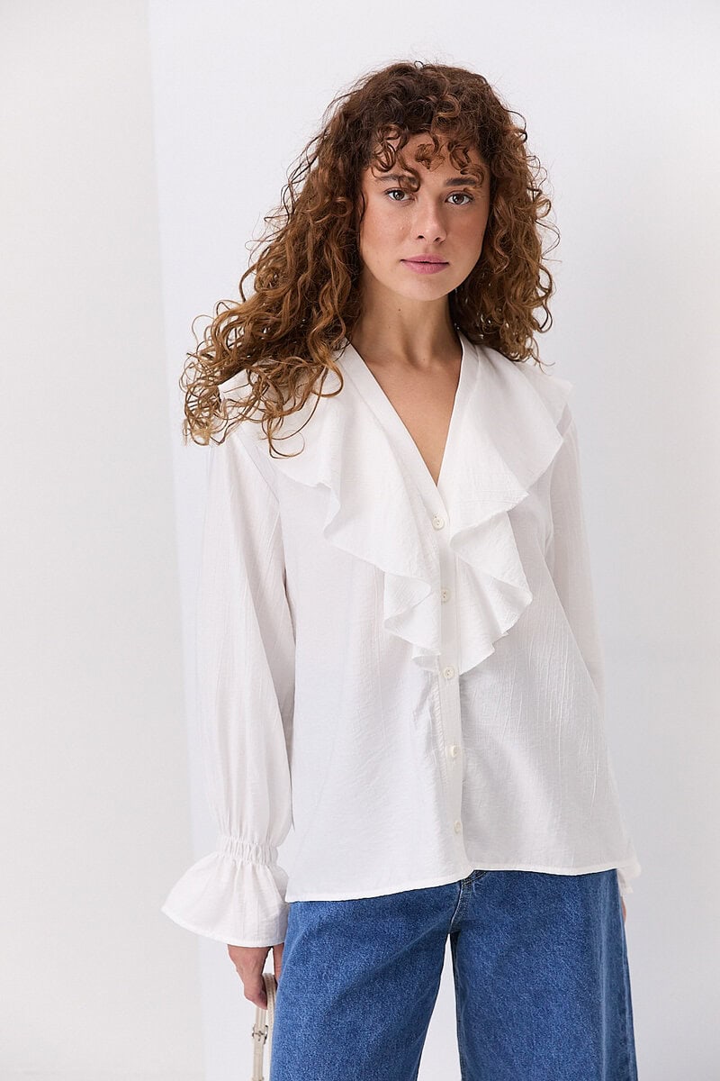 Відкладний комір класичної форми додає образу стриманості та елегантності, роблячи блузу доречною як для офісного стилю, так і для повсякденного носіння. Застібка на ґудзики спереду забезпечує зручність у використанні та дозволяє регулювати глибину вирізу. Рукави можуть бути довгими або ¾, з манжетами на ґудзиках або без них — залежно від моделі.