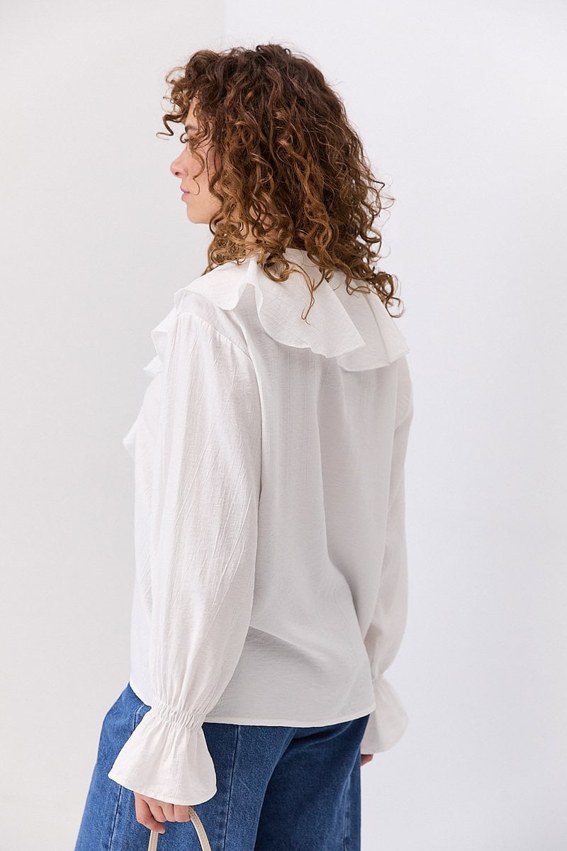Блуза молочного кольору з відкладним коміром і жатим ефектом — це стильний та елегантний елемент жіночого гардероба, який поєднує в собі комфорт і вишуканість. Виготовлена з легкої, приємної до тіла тканини з характерною текстурою жаття, що додає виробу об’єму та візуальної глибини. Молочний відтінок надає блузі ніжності та універсальності, дозволяючи легко поєднувати її з різними елементами одягу.