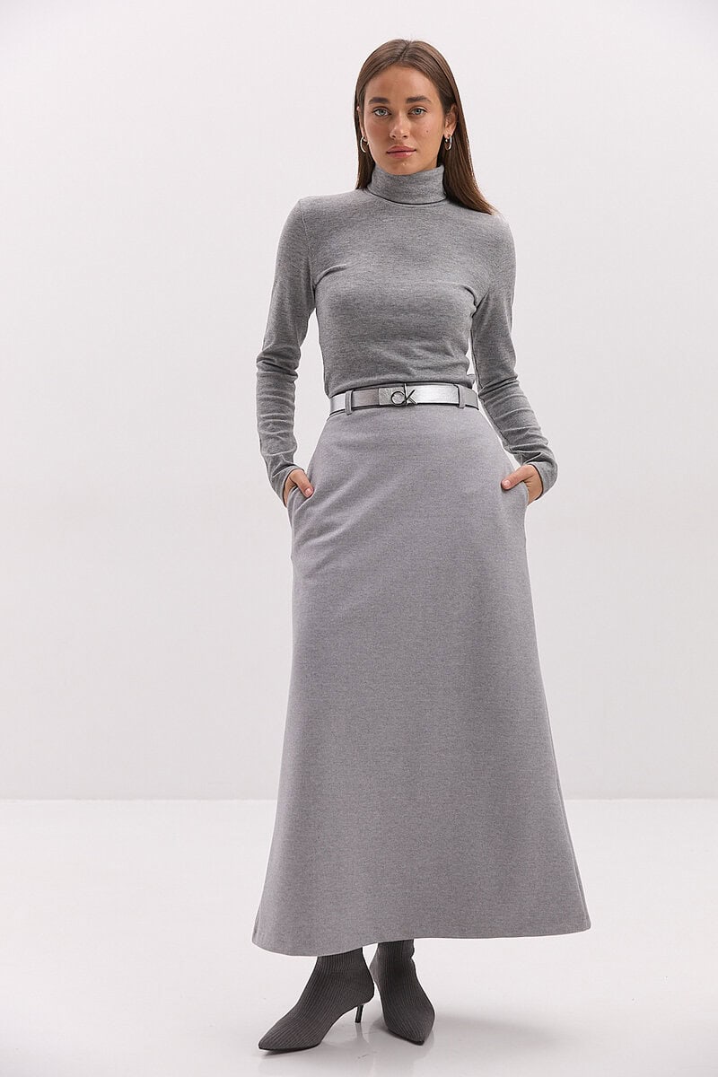 Ця сіра довга спідниця з теплого трикотажу має розріз ззаду.