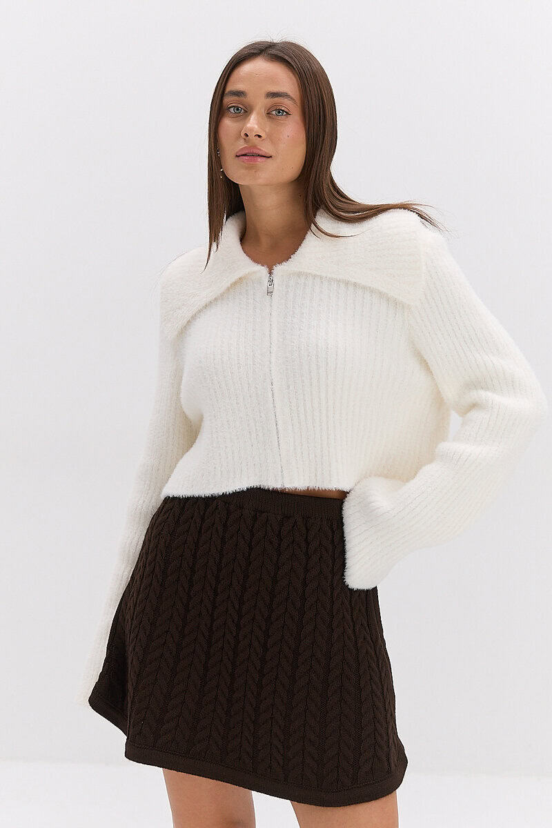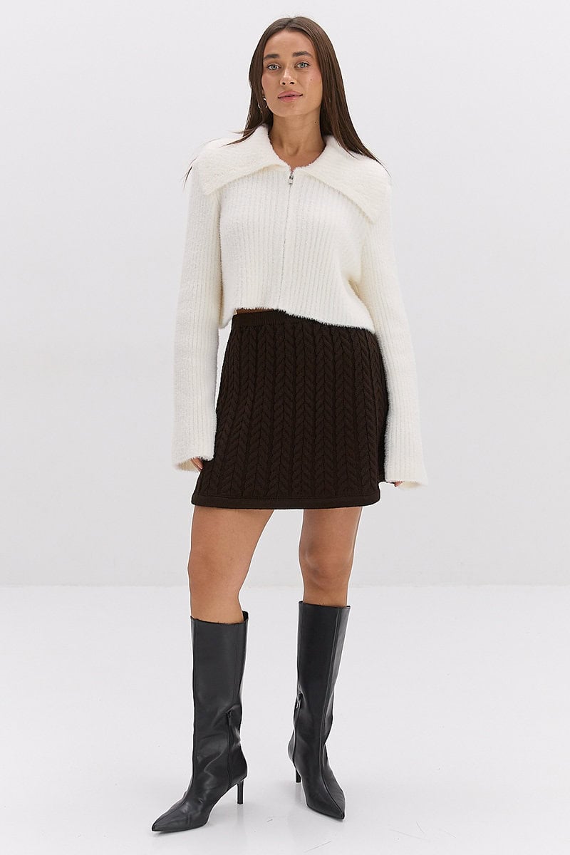Темно-шоколадна коротка в’язана спідниця з косами.