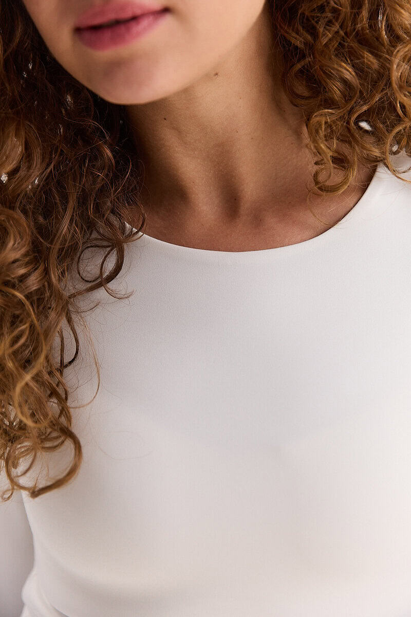Фігурний низ топа підкреслює талію та візуально витягує силует, додаючи жіночності та динаміки образу. Молочний відтінок надає виробу ніжності та універсальності — він легко поєднується з іншими кольорами та підходить як для повсякденного носіння, так і для особливих випадків. Ідеально комбінується з джинсами, спідницями або штанами з високою посадкою. Стильний вибір для тих, хто цінує комфорт, естетику та актуальні модні тенденції.