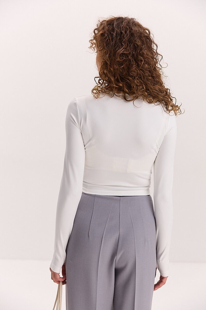 Кроп-топ молочного кольору з довгими рукавами — стильний та сучасний елемент гардеробу, який поєднує комфорт і трендовий дизайн. Виготовлений із м’якого, еластичного трикотажу, що приємно прилягає до тіла та забезпечує зручність у носінні. Довгі рукави оснащені спеціальними вирізами для пальців, що додає образу оригінальності та функціональності, дозволяючи зручно зафіксувати рукав і створити ефект подовжених рук.