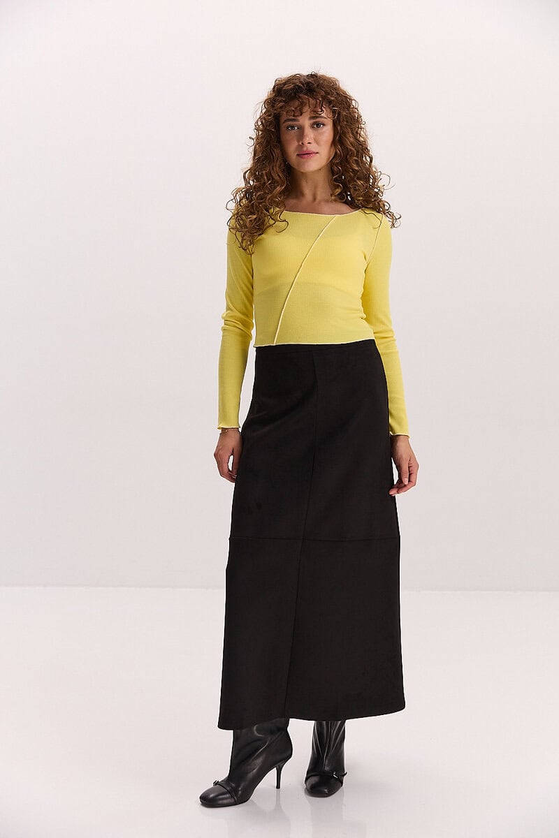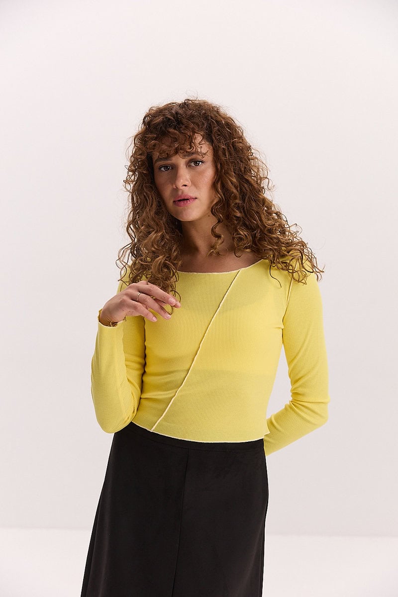 Кроп-топ з довгими рукавами жовтий зі швами назовні — це стильний елемент гардеробу, який поєднує в собі сучасний дизайн та комфорт. Виготовлений з м’якого, еластичного трикотажного матеріалу, що приємно прилягає до тіла та забезпечує зручність у носінні. Яскравий жовтий колір додає образу свіжості та енергії, ідеально підходить для весняно-літнього сезону.