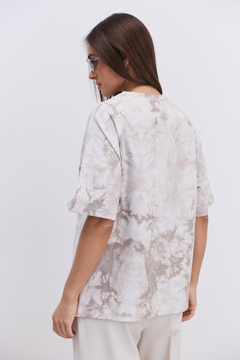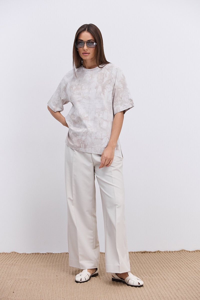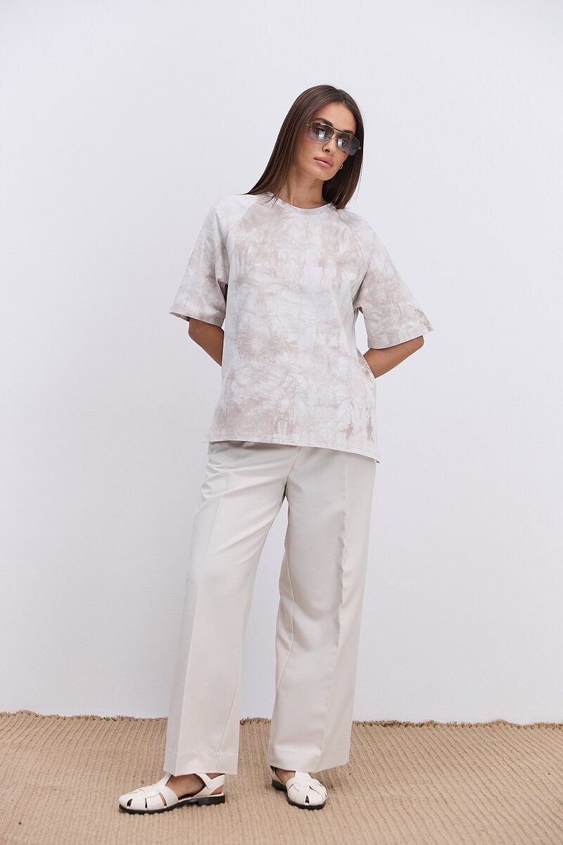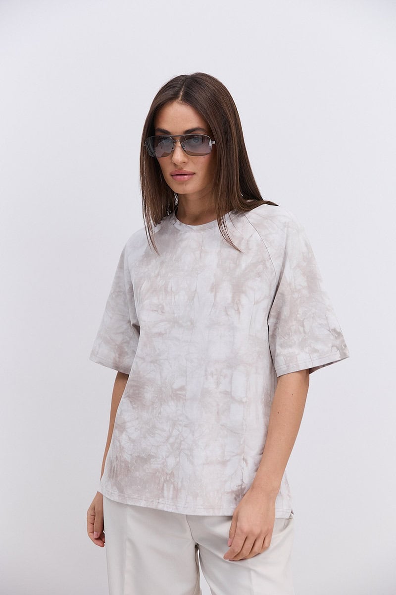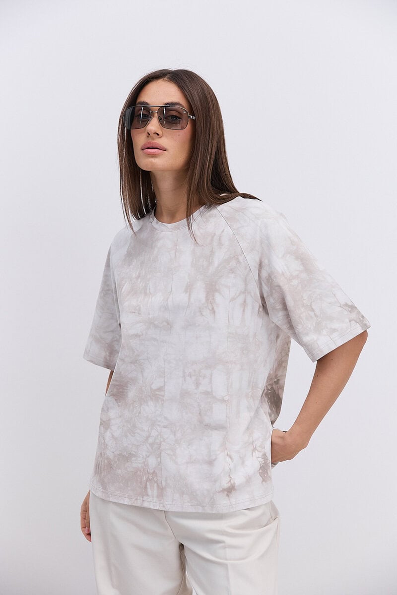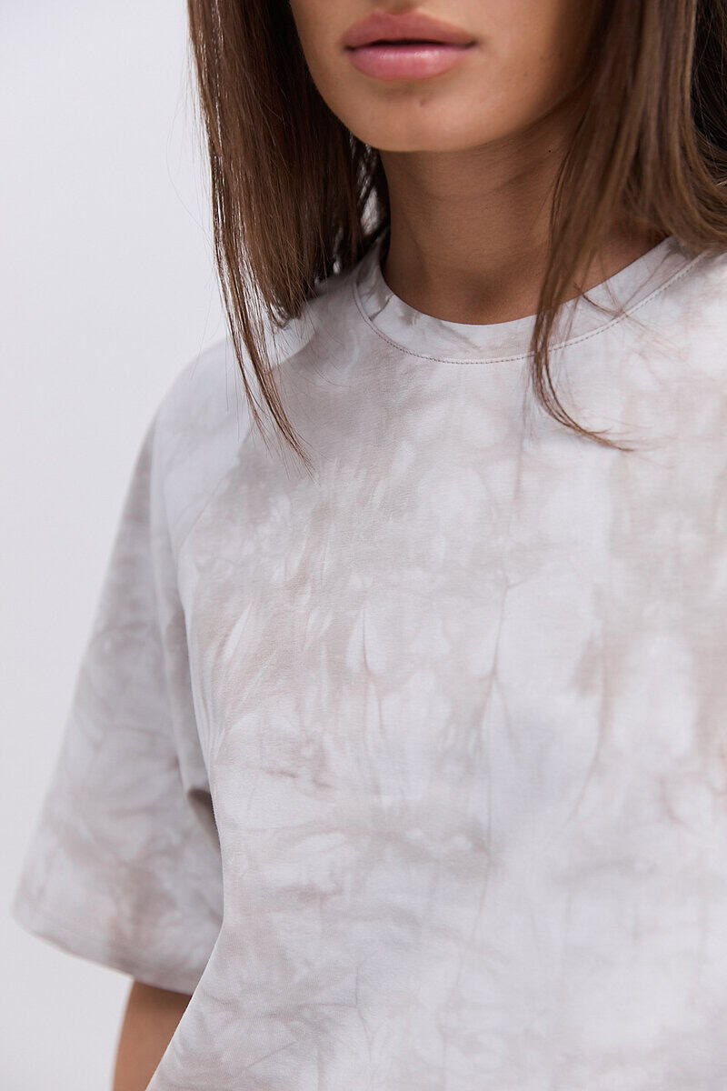 Модель має вільний крій oversize, що дозволяє легко комбінувати її з різними стилями одягу — від спортивного до кежуал. Бежевий колір з ефектом Tie-Dye створює унікальний візерунок, який додає образу індивідуальності та легкого бохо-настрою. Кожна футболка має неповторний малюнок завдяки ручному фарбуванню.