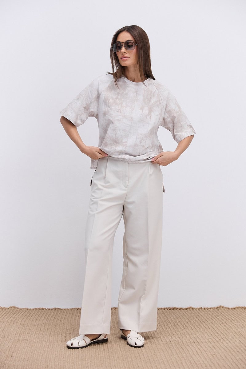 Бічні розрізи додають виробу динамічності та забезпечують додаткову свободу рухів. Подовжений силует дозволяє носити футболку як навипуск, так і заправленою частково або повністю. Круглий виріз горловини та спущена лінія плеча підкреслюють розслаблений характер моделі.