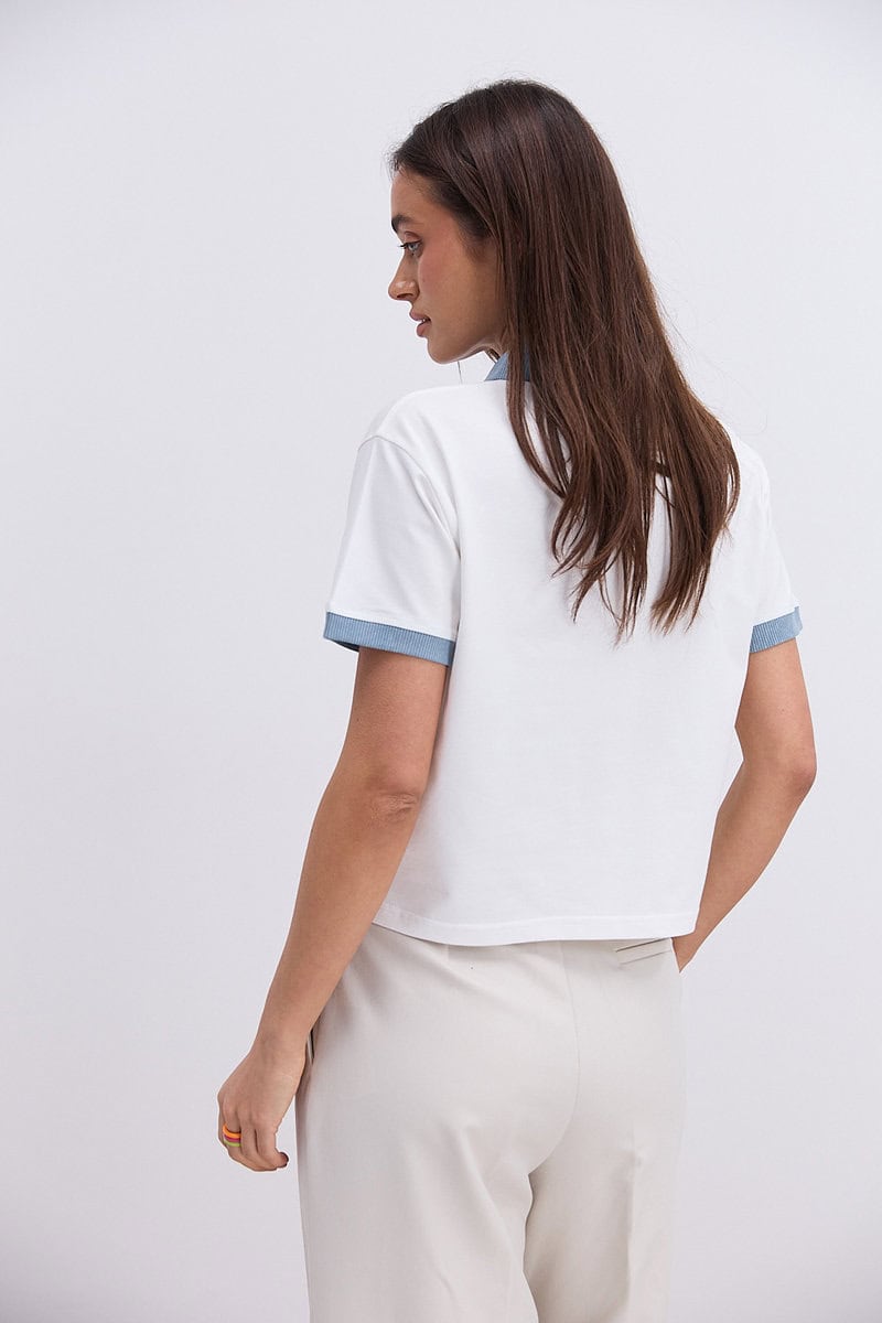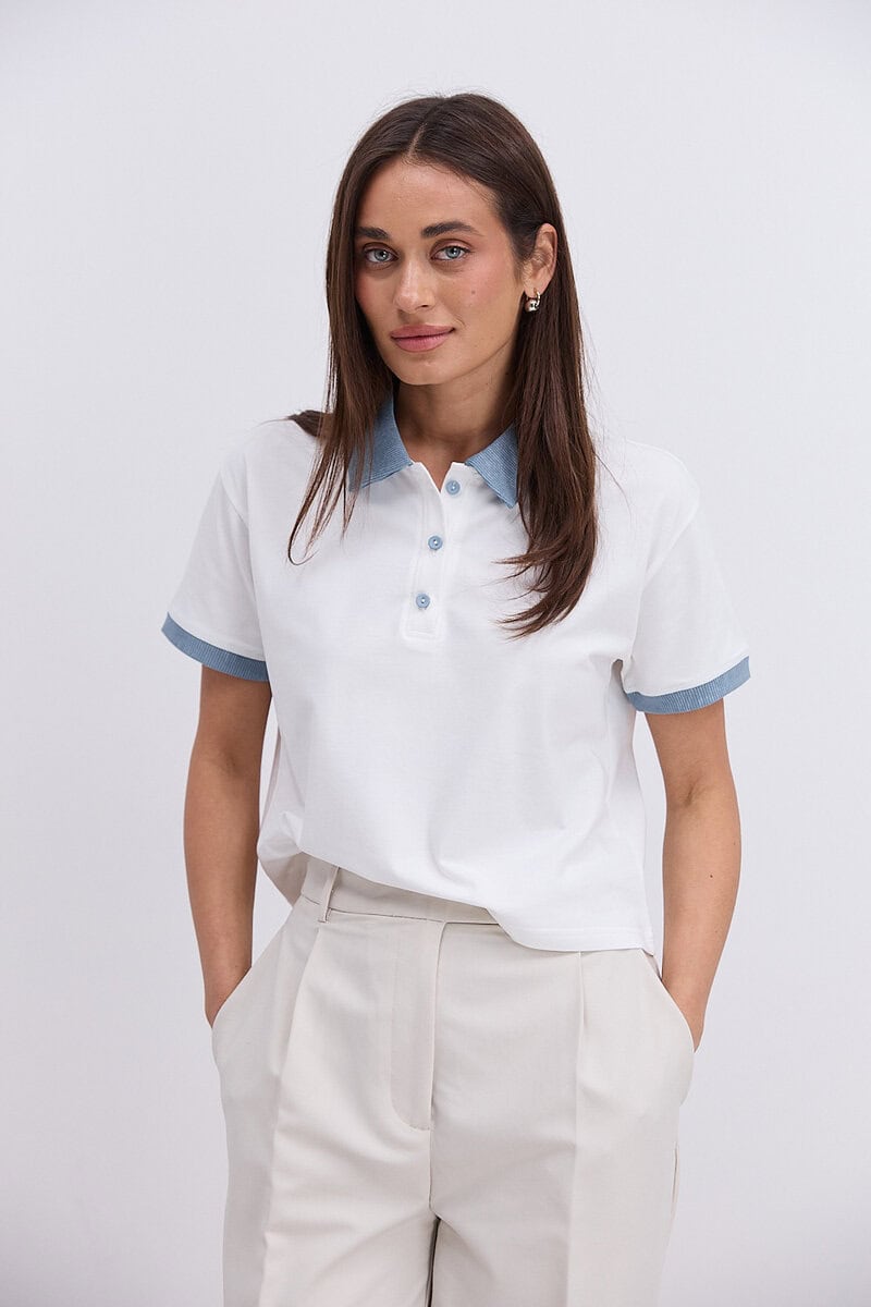 Жіноча футболка поло молочного кольору з блакитним комірцем та манжетами — це стильний та зручний елемент гардеробу, який поєднує в собі елегантність класичного поло та ніжність пастельних відтінків. Виготовлена з якісного бавовняного трикотажу з додаванням еластану, футболка забезпечує комфорт протягом усього дня, добре пропускає повітря та зберігає форму після прання.