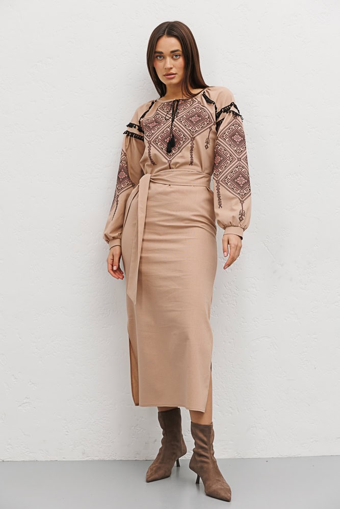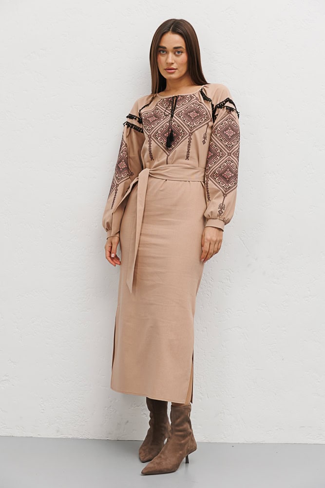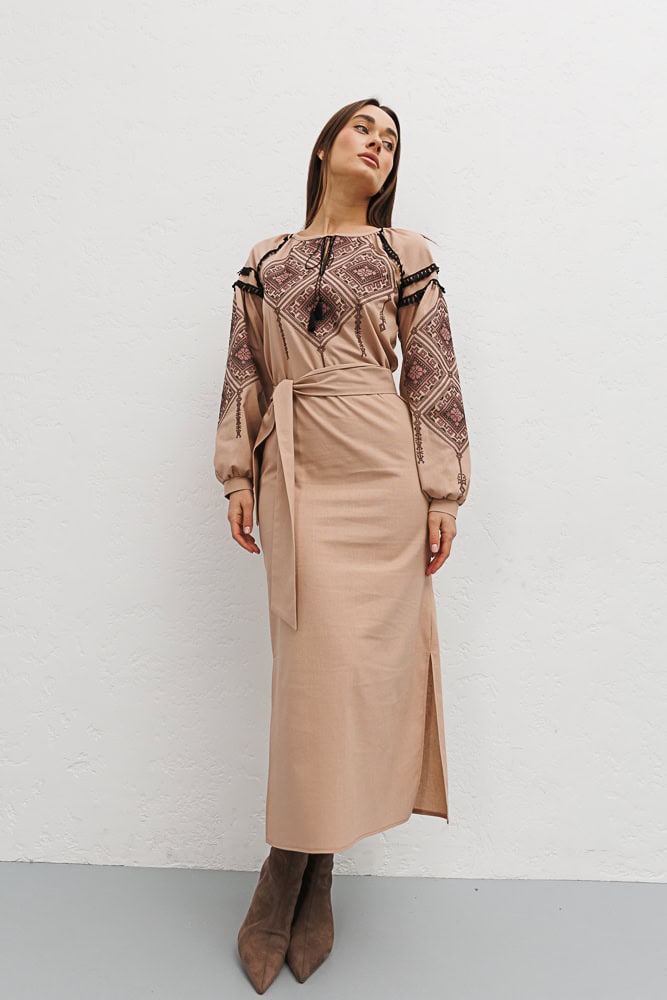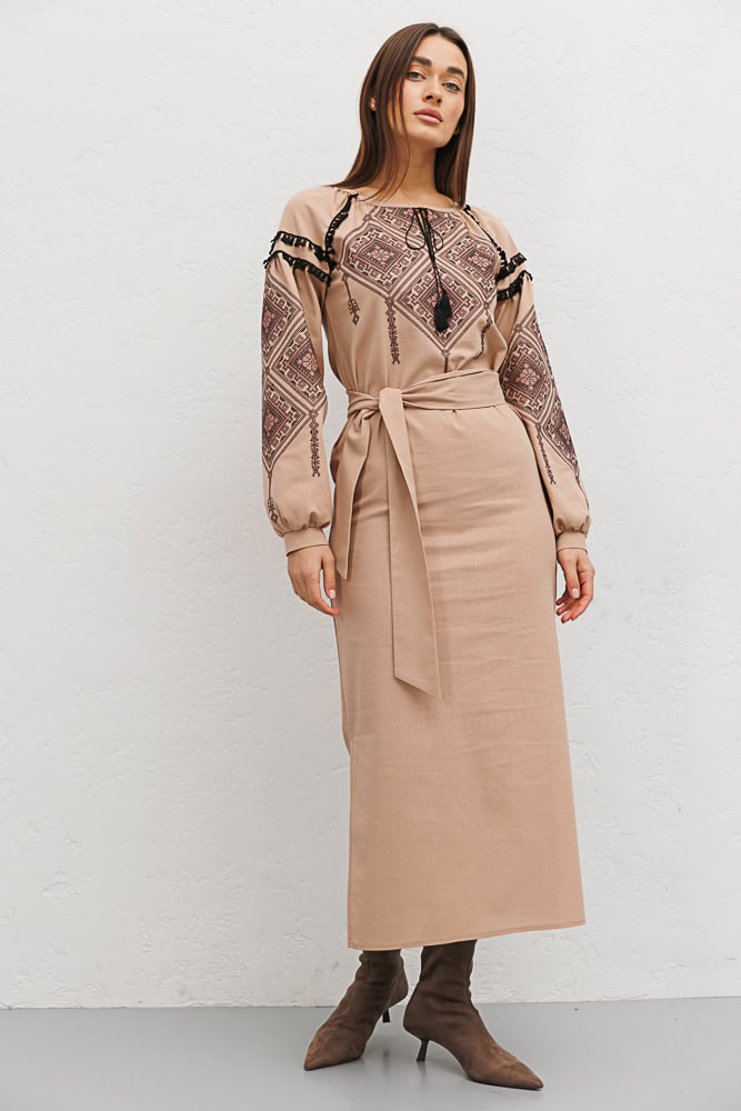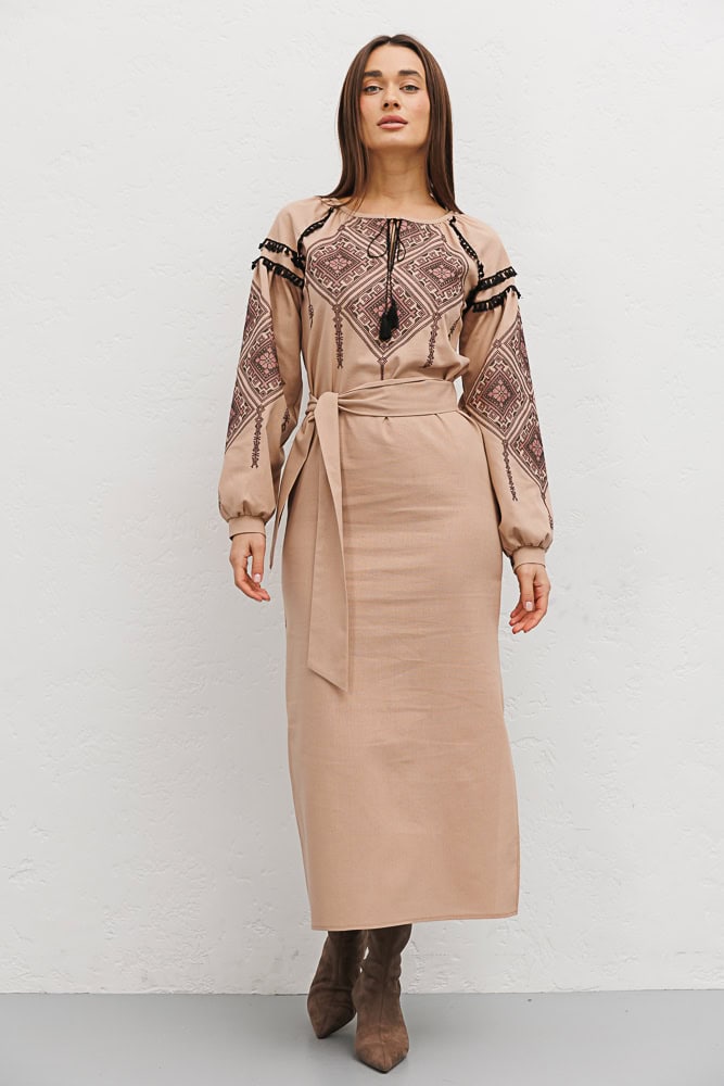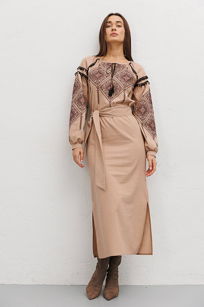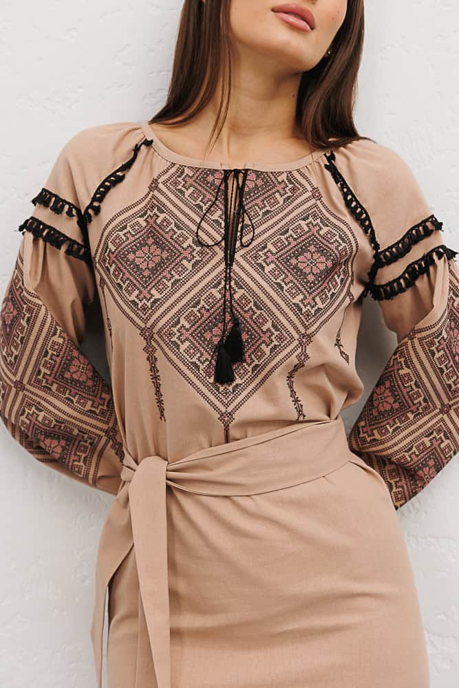 Жіноча сукня-вишиванка бежева з ромбами хрестиком — це вишукана та стильна інтерпретація традиційного українського одягу, яка поєднує в собі етнічні мотиви та сучасний дизайн. Виготовлена з натуральної тканини (льон або льон з домішками бавовни), сукня має приємну до тіла текстуру, забезпечує комфорт у носінні та добре пропускає повітря.