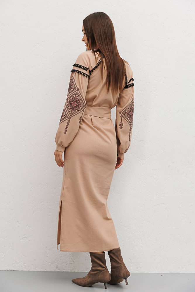 Основний колір виробу — ніжний бежевий, що надає сукні стриманого та елегантного вигляду. Головним декоративним елементом є вишивка у вигляді геометричних ромбів, виконана технікою хрестик. Візерунок розташований на грудях, рукавах та подолі, створюючи гармонійний і збалансований образ. Вишивка може бути виконана нитками контрастного кольору — бордового, чорного або темно-синього, що підкреслює традиційний характер орнаменту.