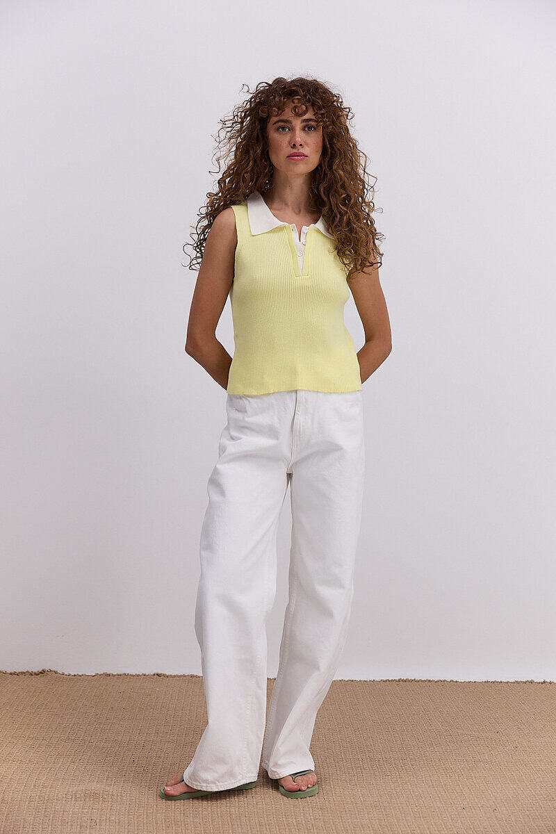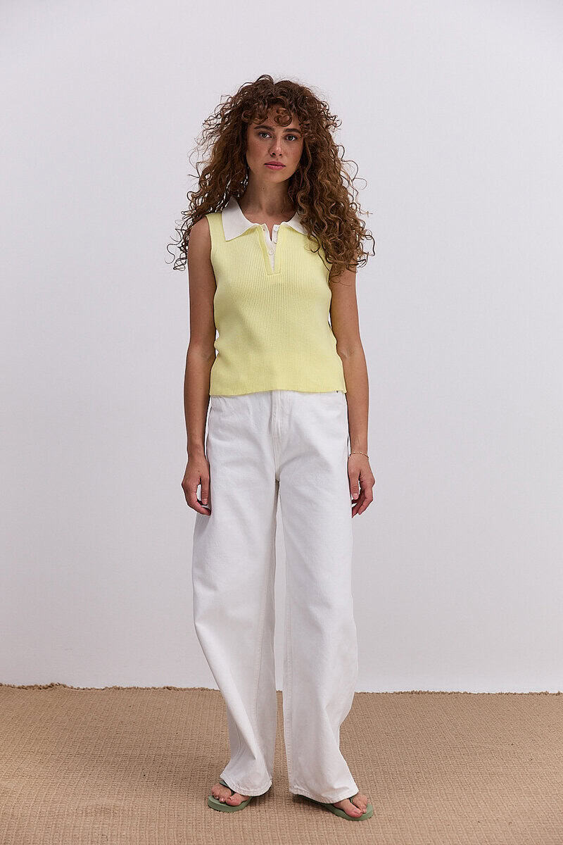 Майка має приталений силует, що гарно підкреслює фігуру, а класичний комір поло з гудзиками додає образу стриманої елегантності. Лимонний відтінок надає свіжості та яскравості, ідеально підходить для весняно-літнього сезону. Безрукавний крій забезпечує свободу рухів і дозволяє носити майку як самостійно, так і в поєднанні з жакетами чи кардиганами.
