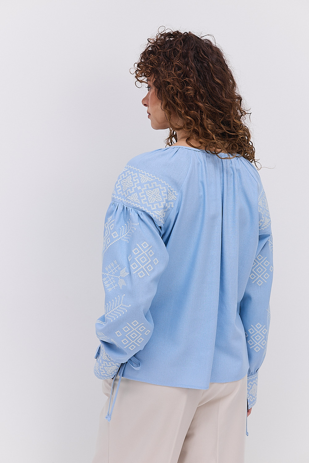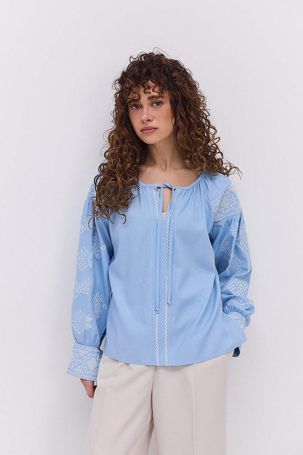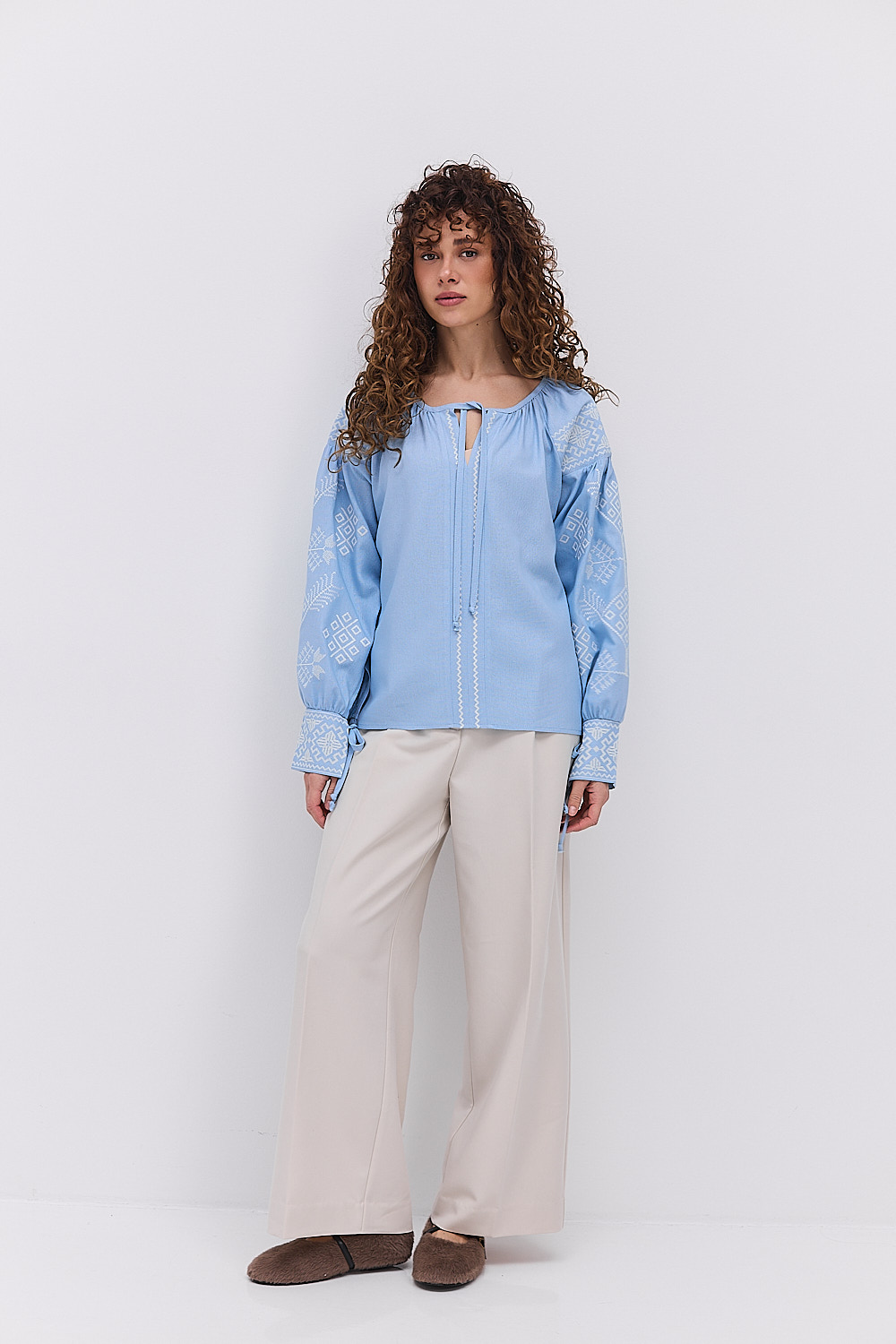 Жіноча вишиванка блакитна з молочною геометрією гладдю і зав'язками на манжетах