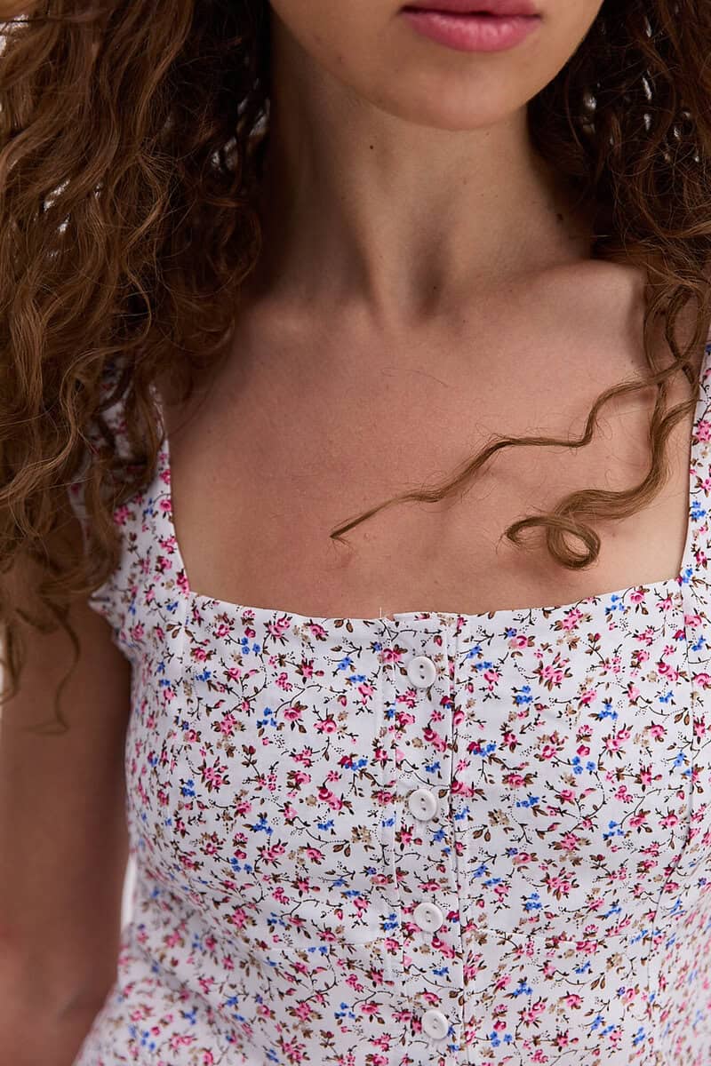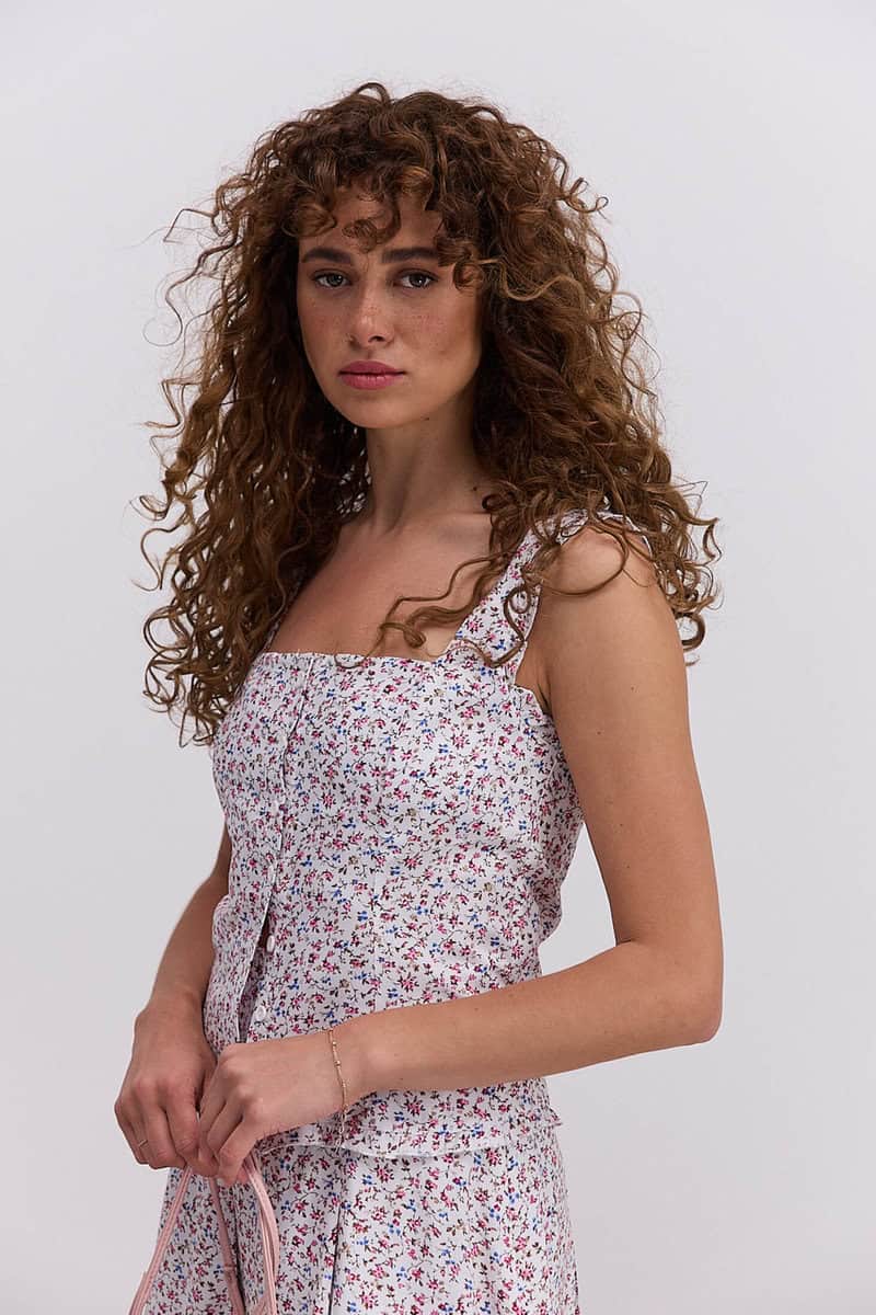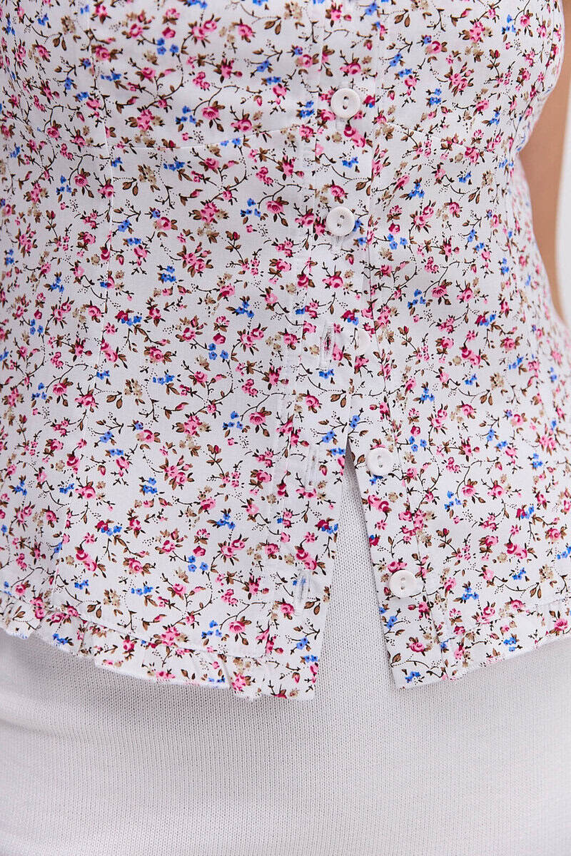 Жіночий літній топ молочного кольору з рожевими квітами — це стильний та легкий елемент гардеробу, ідеальний для спекотних літніх днів. Виготовлений із натуральної дихаючої тканини (бавовна або віскоза), він забезпечує комфорт навіть у найспекотнішу погоду. Молочна основа топа створює ніжний, витончений фон, який гармонійно поєднується з делікатним квітковим принтом у рожевих відтінках.