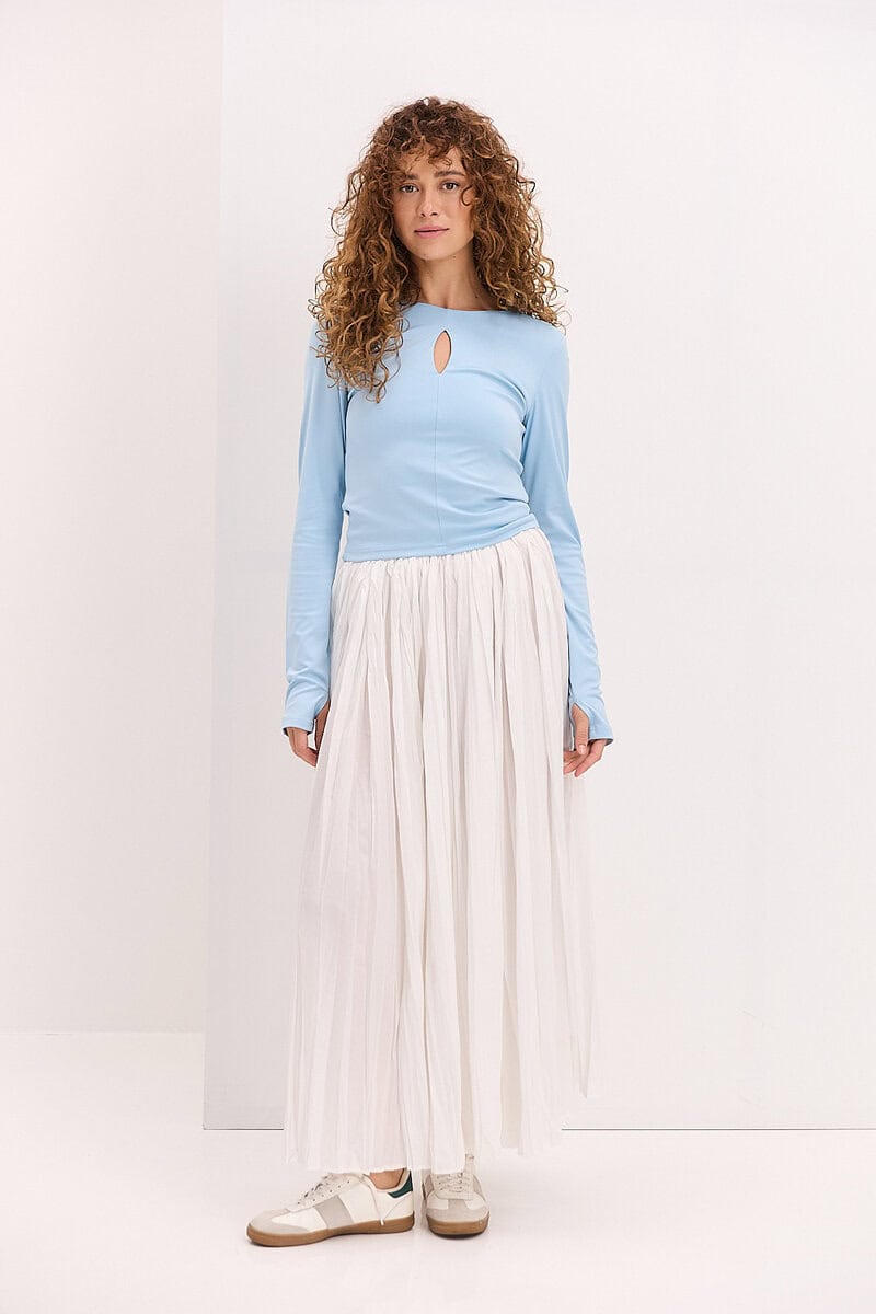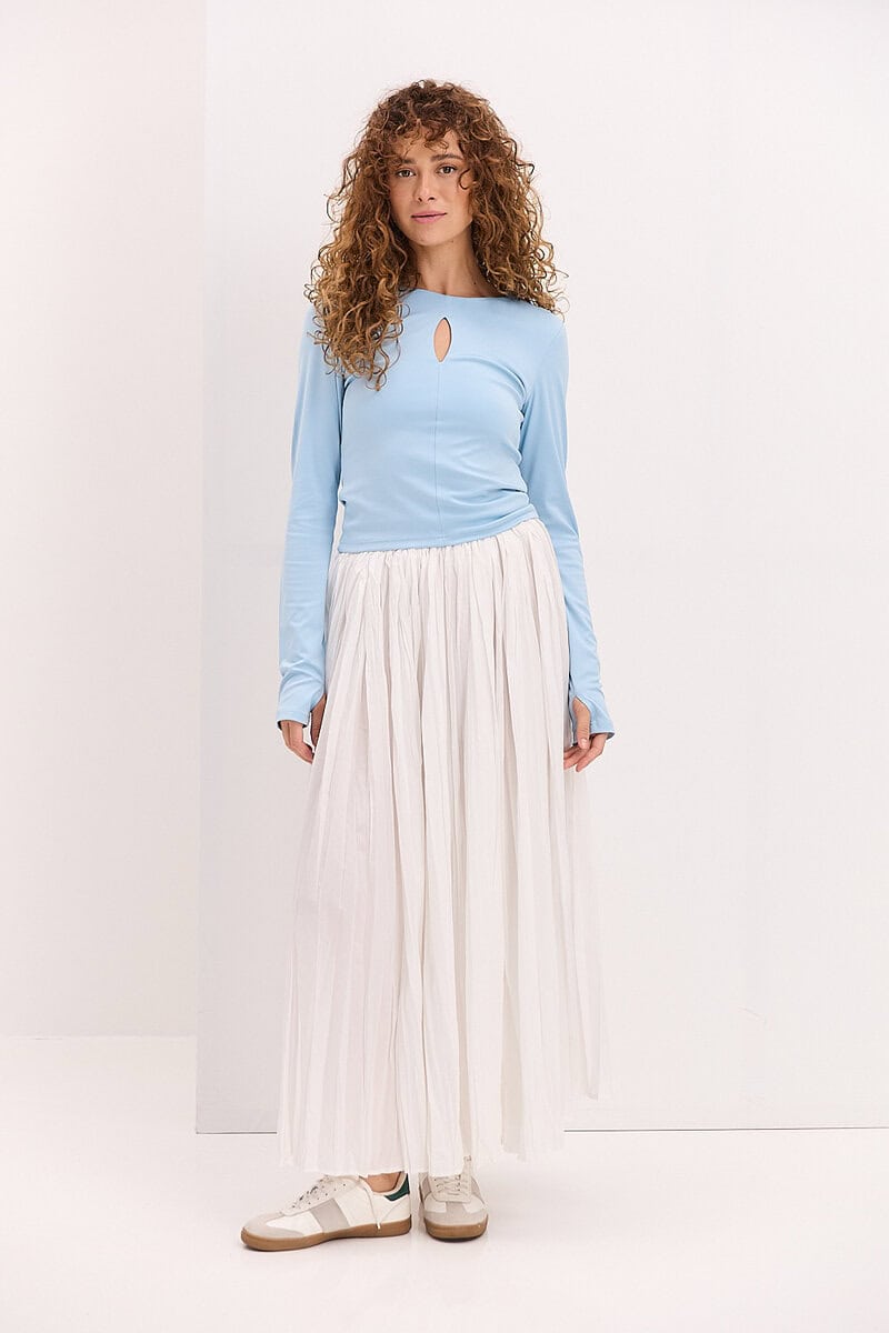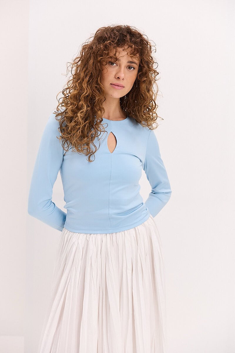 Особливістю моделі є елегантний виріз над грудьми, який створює ефектний акцент і додає образу жіночності та привабливості. Виріз має м’які округлі лінії, що гармонійно поєднуються з загальним дизайном виробу. Блакитний колір надає свіжості та легко комбінується з іншими елементами гардеробу — джинсами, спідницями або штанами.