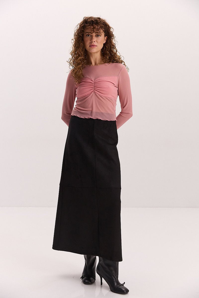 Будьте першим, хто залишив відгук на “Жіночий лонгслів з сіточки рожевий з драпіруванням і вставкою на грудях”