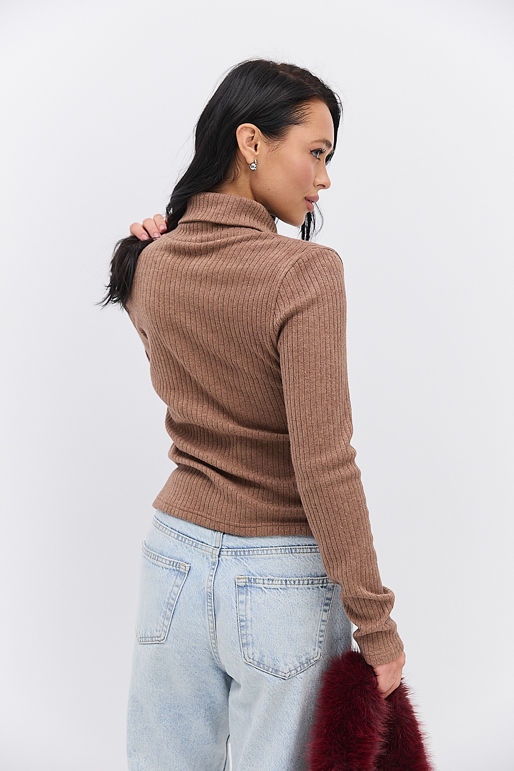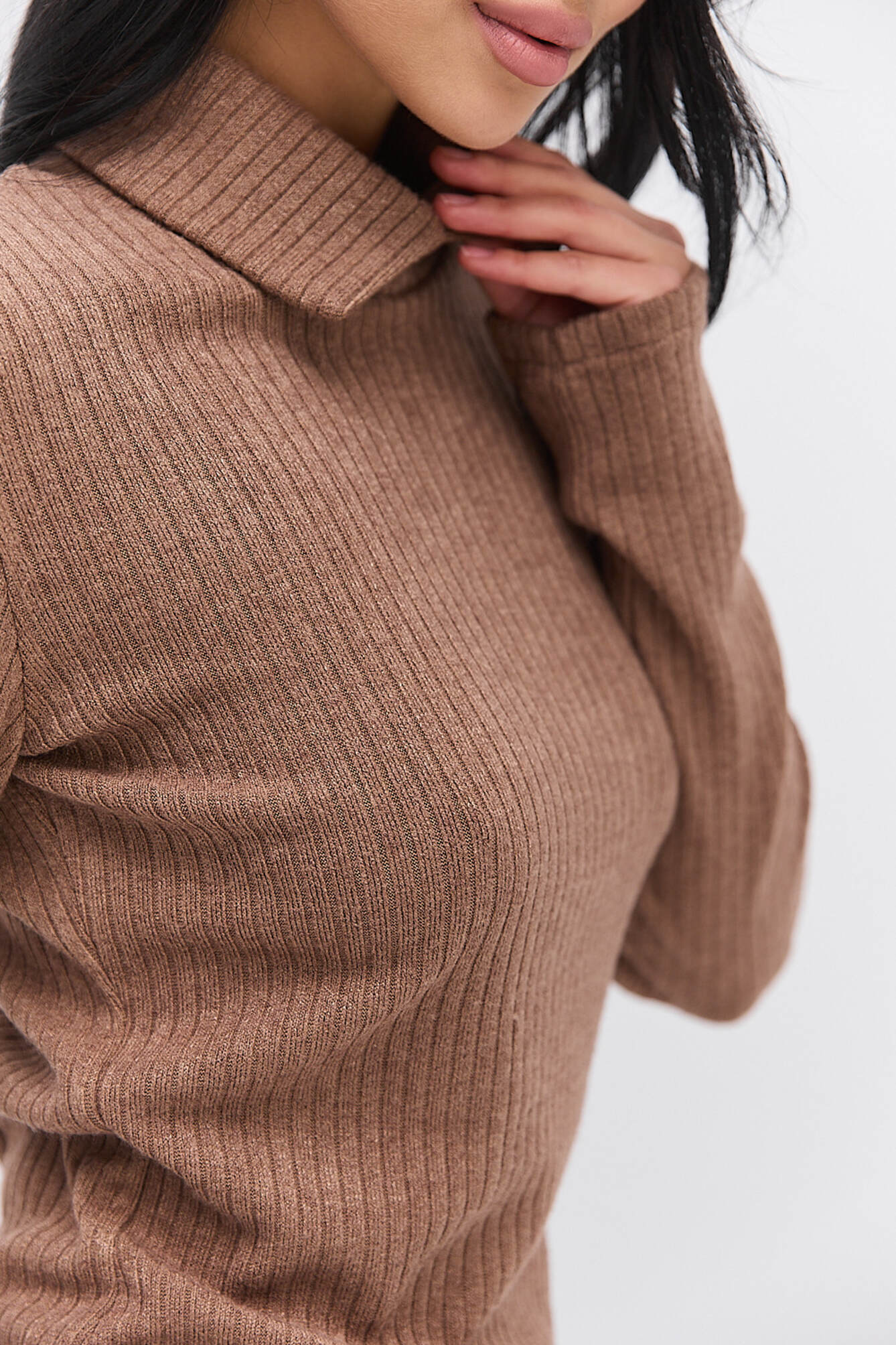 Жіночий теплий лонгслів в рубчик коричневий зі стояче-відкладним коміром