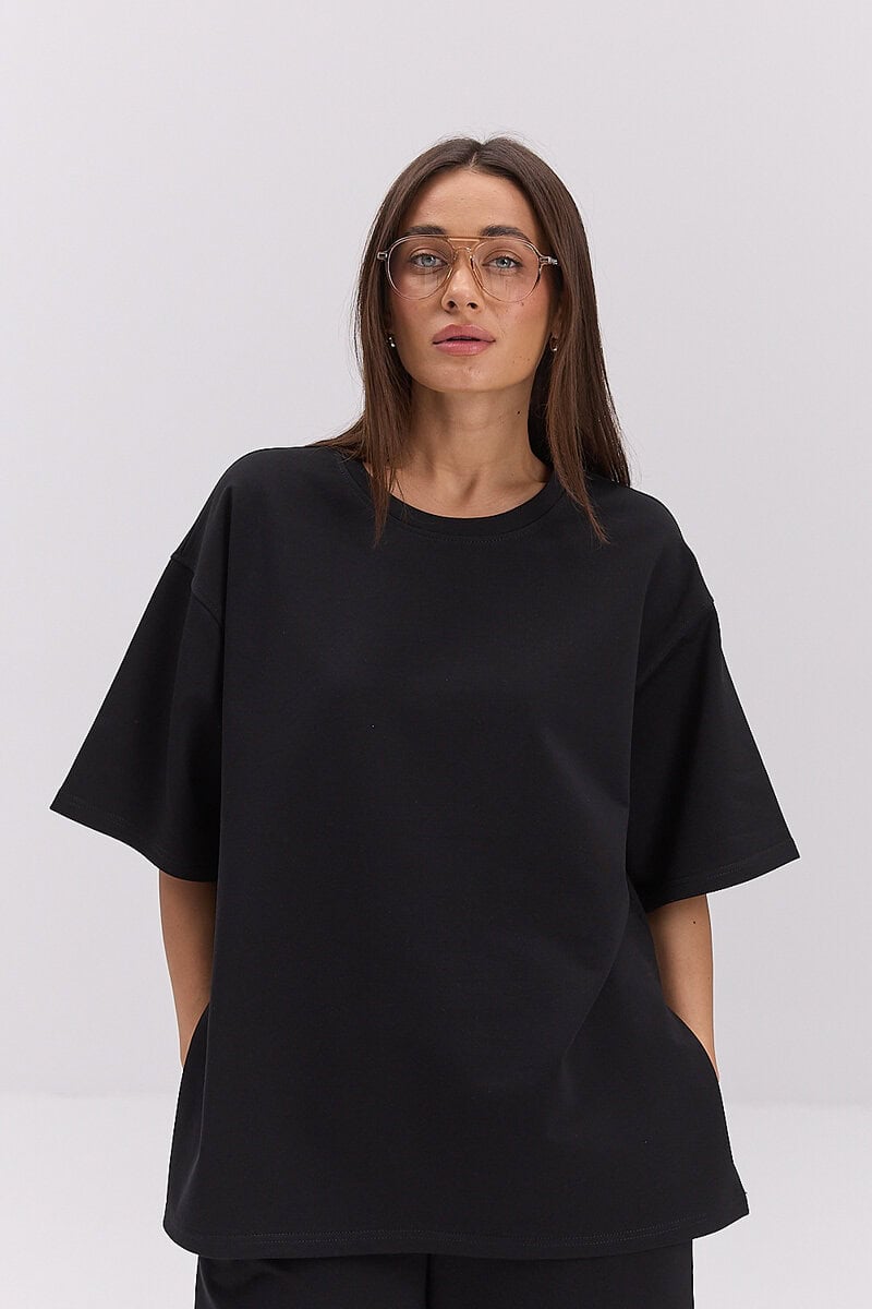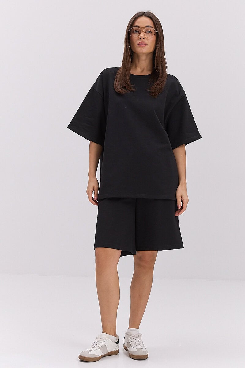 Жіночий трикотажний костюм з шортами і футболкою чорного кольору – це стильний і комфортний комплект для повсякденного носіння. Він складається з двох елементів: футболки вільного крою та шортів із зручною посадкою.